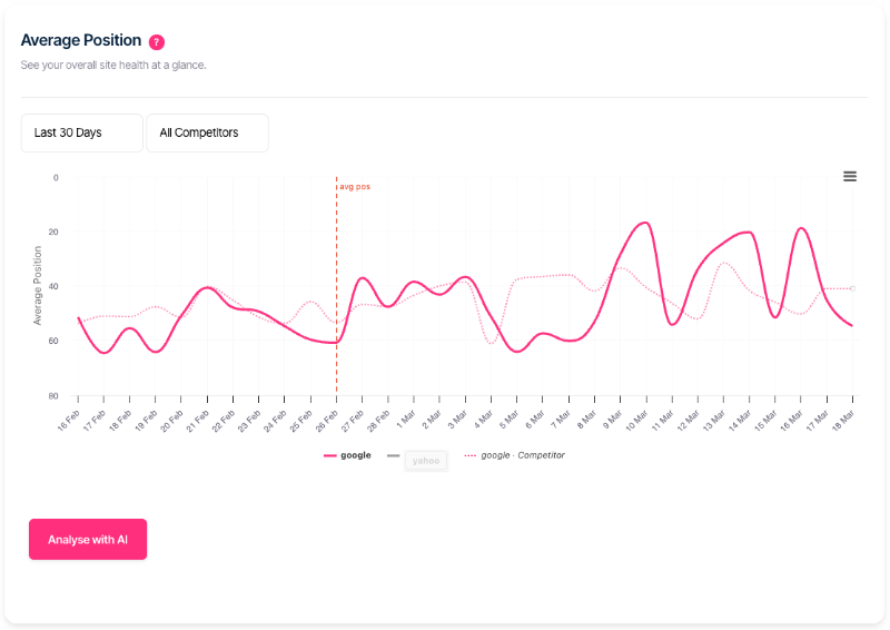 The Average Position Chart tracks where a website appears in search results over time — revealing whether rankings are improving, declining, or holding steady, and routing priority actions to the right tool.