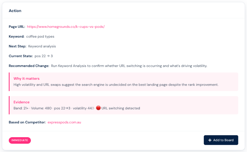 The Board is wheremore's project and task management tool. Adding an action creates a task with the keyword, page URL, and recommended next step pre-filled, ready to action.