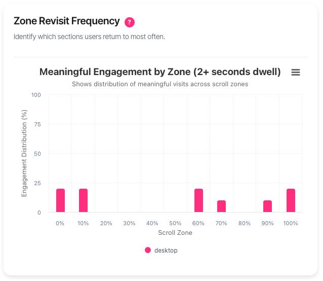 The Scroll Depth vs Time Spent chart shows average time at each zone. This chart shows the distribution of meaningful engagement—where visitors choose to focus their attention across the entire page. Both provide valuable but different perspectives.