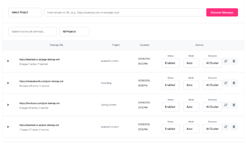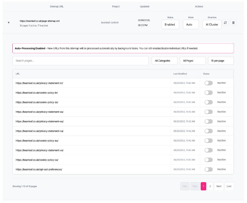 The Sitemap Manager centralises URL discovery and control for SEO tracking. It handles sitemap imports, URL activation, and organises pages into path-based groups for efficient bulk management.