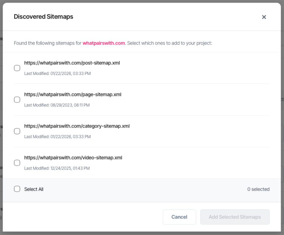 | New project needs URLs | Use Discover Sitemaps to find and add sitemaps automatically. |