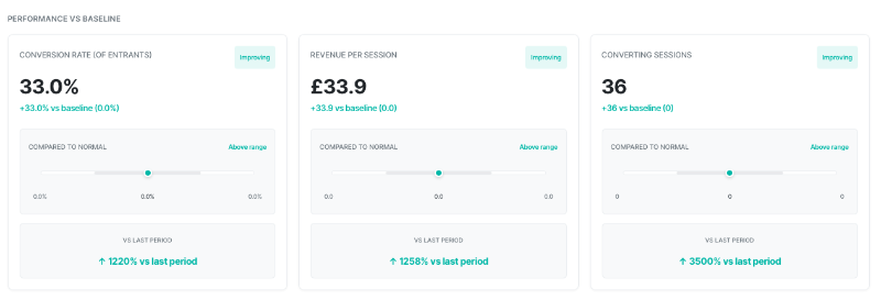These three cards compare current performance against established baselines. Each card shows the current value, a status badge indicating trend direction, how the value compares to the normal range, and the change versus the previous period.