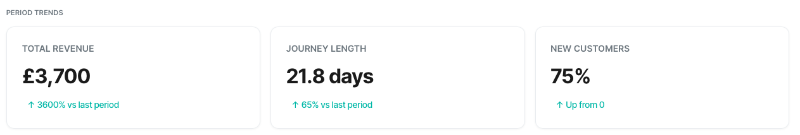 Some metrics require cookie tracking to be enabled on the domain. When cookie tracking is disabled, Journey Length and New Customers cards are hidden. The remaining metrics continue to function using session-based tracking.