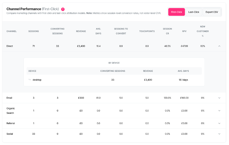 Click Export CSV to download the table data. The export includes all visible columns and respects the current attribution model selection. Use exports for deeper analysis in spreadsheets or reporting tools.