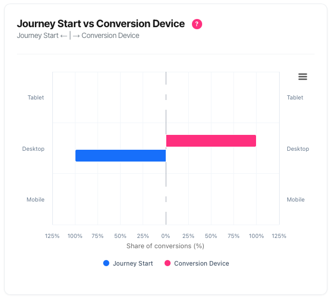 The centre line represents 0%. Bars extend outward showing the percentage of converting sessions for each device. If both sides show similar distributions, customers tend to stay on the same device type. If distributions differ, cross-device journeys are common.