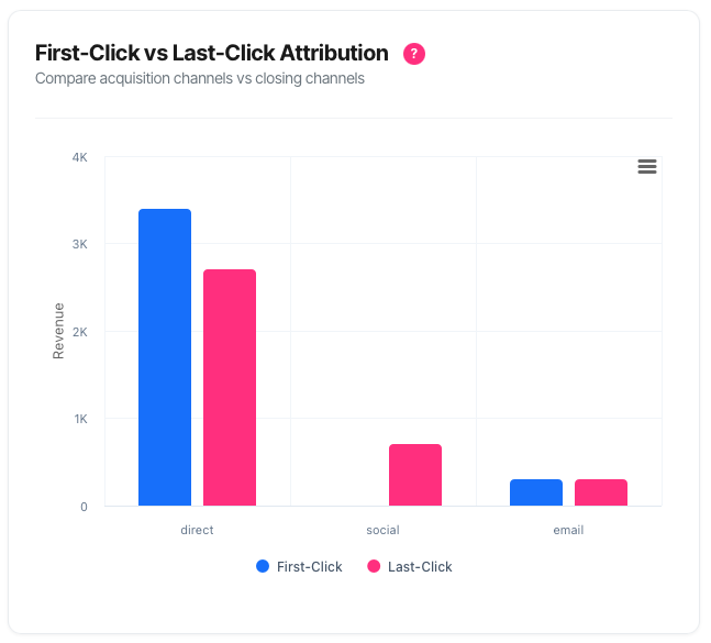 | Last-click much higher than first-click | Strong closing channel. Converts customers introduced elsewhere. Ensure upstream channels keep feeding it. |