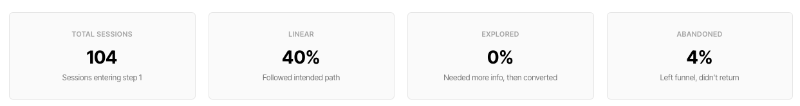 | Abandoned | Percentage of sessions that left the funnel and never returned. These represent potential conversions lost to friction or unclear next steps. |