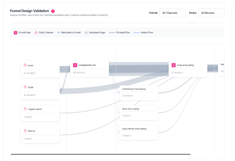 The Funnel Design Validation chart shows whether users follow your intended conversion path or explore elsewhere before converting—revealing friction points and opportunities to improve funnel design.