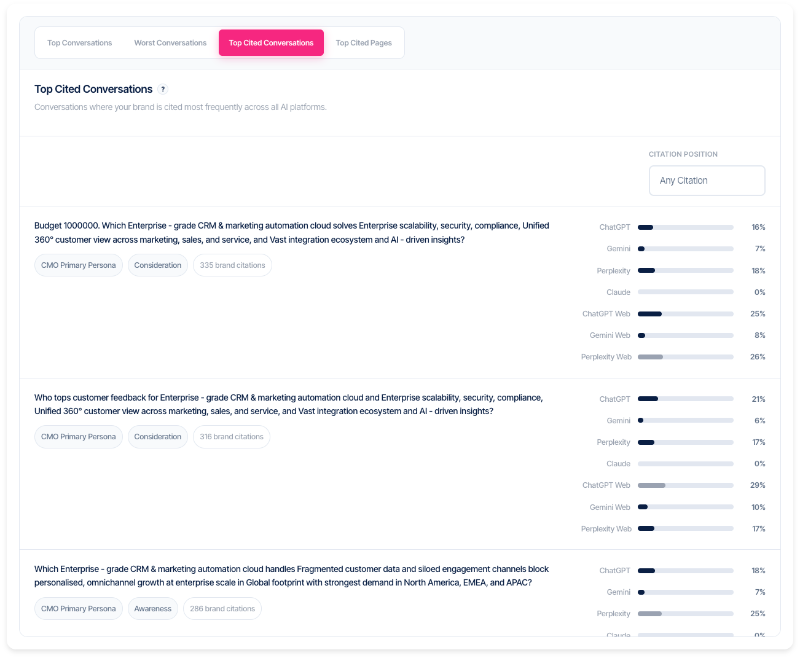 Top Cited Conversations shows which AI conversation prompts generate the most brand citations across AI platforms—identifying where visibility is strongest and where attention is needed.