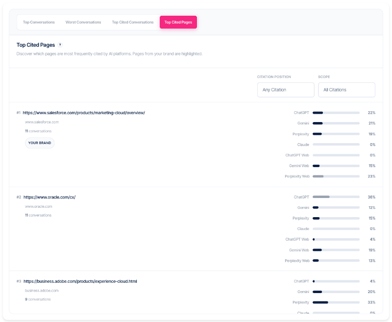 | All Citations | Every cited page regardless of domain—brand pages, competitor pages, and third-party sources |