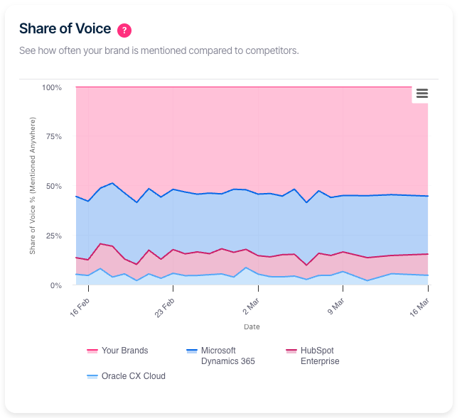 | Stacked area chart | Shows the percentage breakdown of AI mentions across tracked brands each day |