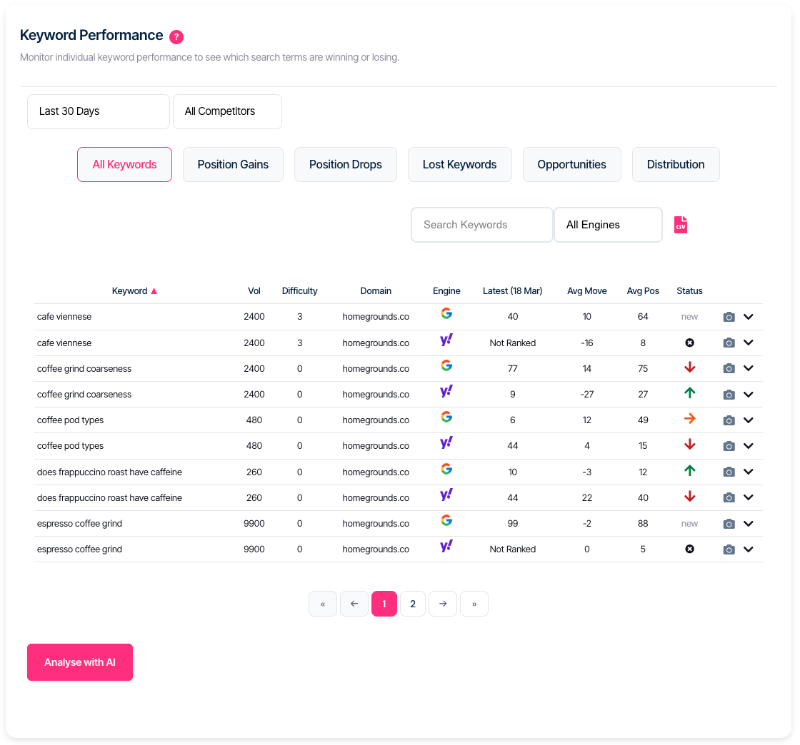 3. Review the keyword table — check positions, movement, and status.
