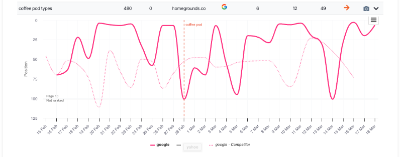 • Hover over any data point to see the exact date, position, and search engine for all visible lines.