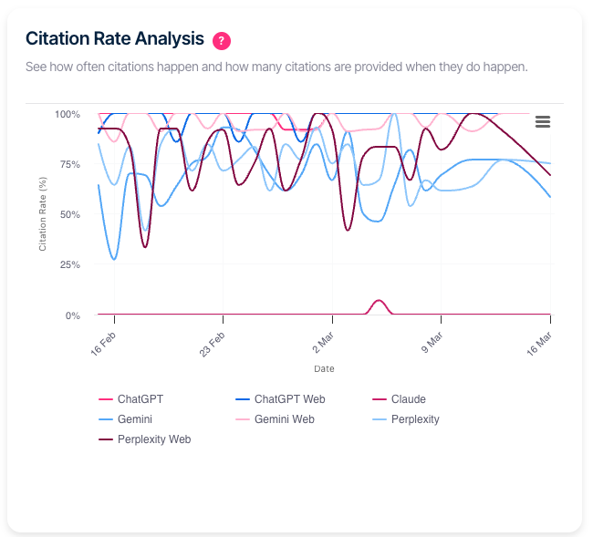 The Citation Rate Chart tracks how often AI platforms mention a brand in their responses over time—showing whether AI visibility is improving, declining, or holding steady.