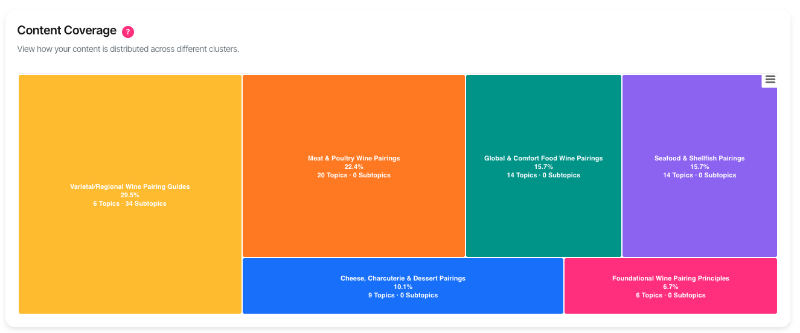 The Content Coverage and Distribution treemap reveals how content is balanced across topic clusters—highlighting which areas dominate the strategy and which need attention.
