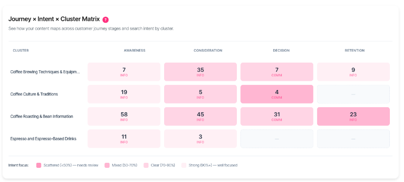 The Journey Intent Cluster Matrix reveals how content is distributed across clusters, journey stages, and search intents—highlighting where focus is scattered and where strategic alignment is strong.