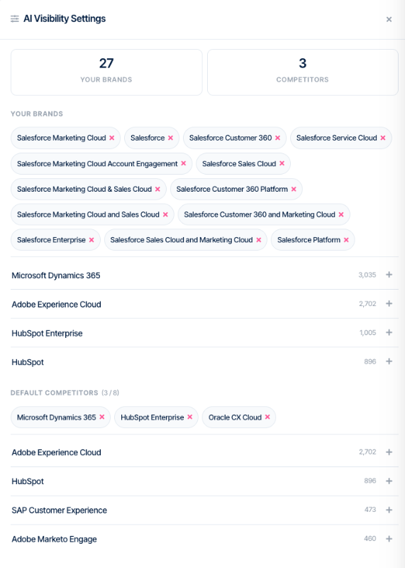 Competitors are drawn from the discovered-brands pool — brands that have appeared in AI responses in the past 90 days. A rival that hasn't appeared recently won't show in the available list until it does.