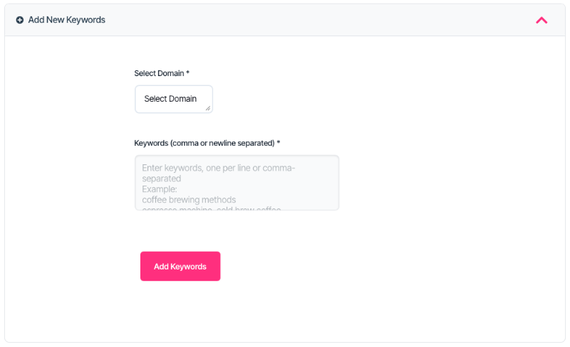 Keywords can be added individually or in bulk. Each keyword is linked to a specific domain.