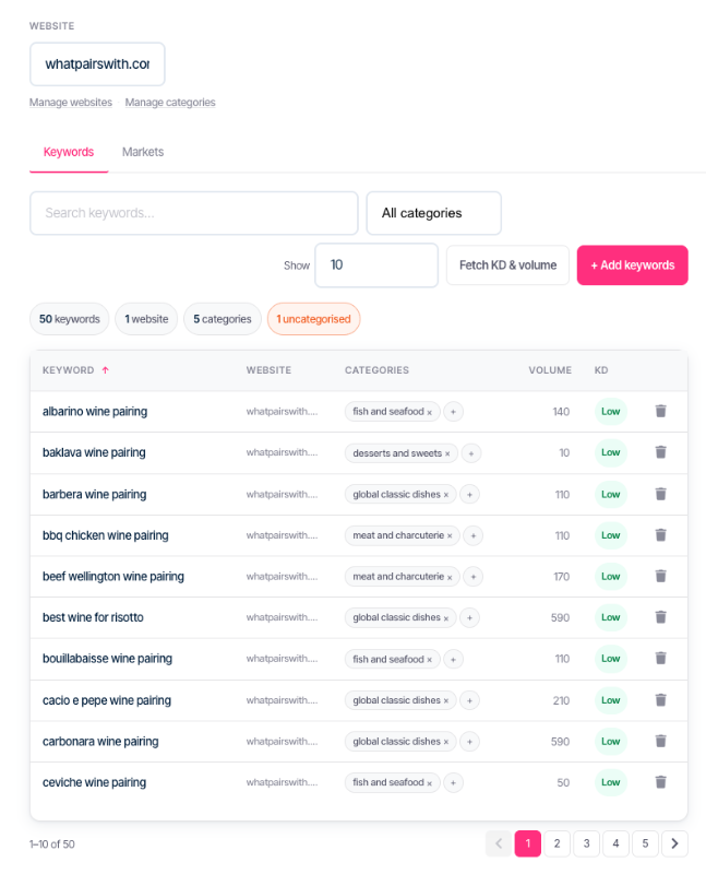 Click any column header to sort the table. Use the search box to filter by keyword text, or select a category to narrow the view. The stats bar above the table shows total keywords, websites, categories, and an alert for any uncategorised keywords.