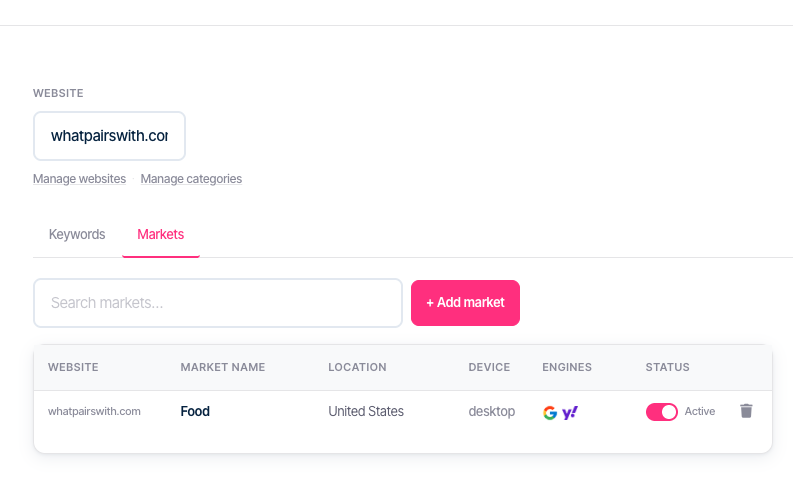 Use the toggle in the Status column to switch a market between Active and Paused. Pausing suspends ranking checks without deleting data.