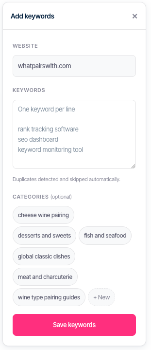 Keywords belong to a specific website. The panel accepts multiple keywords at once — one per line.