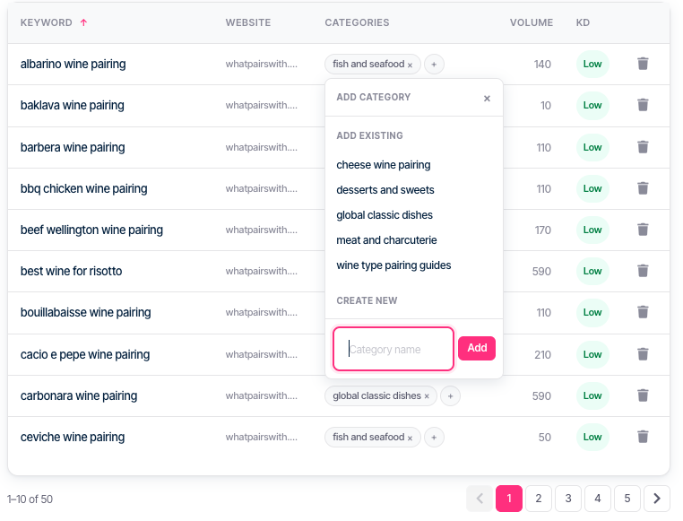 In the Keywords table, find the keyword and click Assign category (or the + button if it already has categories). The popover shows existing categories for that website and an option to create a new one.