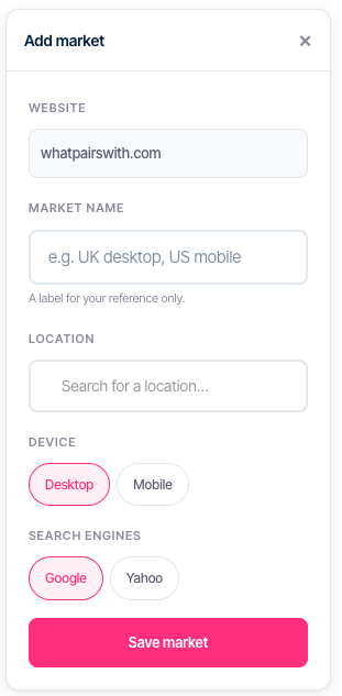 Markets control which contexts wheremore checks rankings for. A website can have multiple markets — for example, separate markets for UK Desktop and US Mobile.