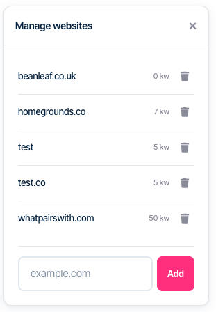 Click the delete icon next to the website in the Manage websites panel. Deleting a website permanently removes all its keywords, categories, and markets.