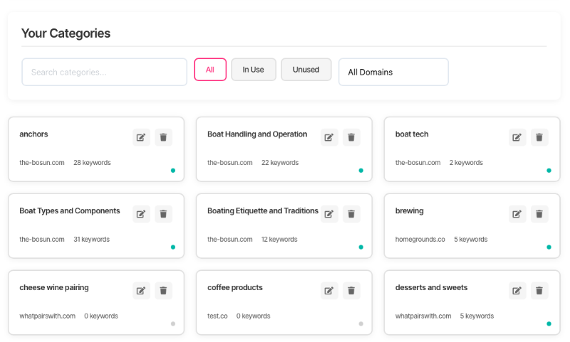 Filters can be combined. Select "Unused" and a specific domain to find categories that need attention on that domain.
